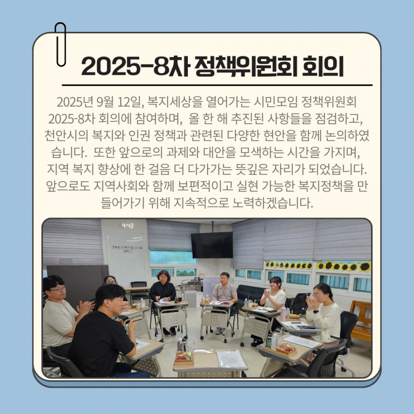저희 센터에서는 복지세상을 열어가는 시민모임 정책위원회 2025-8차 회의에 참여하여 2025년 추진사항을 점검하고 지역 복지·인권 정책의 과제와 대안을 모색했습니다.