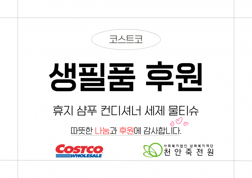 코스트코 생필품 후원 페이지 정보 작성자 운영자 작성일26-02-05 14:15 조회156회 댓글0건 관련링크 목록 본문 26.02.04.(수)코스트코 천안지점에서 휴지, 샴푸, 컨디셔너, 세제, 물티슈를 후원해주셨습니다.천안죽전원 가족분들이 일상생활에서 잘 사용하실 수 있도록 지원하겠습니다.천안죽전원에게 사랑과 나눔을 해주신 코스트코에게 다시한번 감사의 말씀을 드립니다.감사합니다. 댓글목록 등록된 댓글이 없습니다. 목록