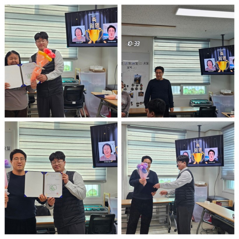2월 자치회의 시간, 우리 센터에 설레는 순간이 찾아왔습니다. 이용인들이 직접 투표로 선출한 자치회장과 부회장의 임명식을 진행했기 때문입니다. 모두의 박수 속에 임명장을 수여하고, 두 사람의 당찬 1년 각오를 들어보는 시간은 그 어느 때보다 진지하고 빛났습니다.